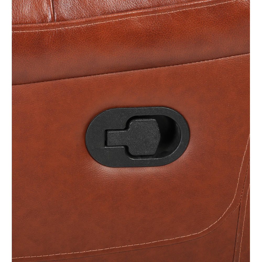 The Joy Two-seater recliner sofa, upholstered in half leather chestnut two-tone, will definitely please your guests. The spacious seating area is filled with a warm, fuzzy feel so you can relax and feel comfortable. Just pull the latch to recline the two-section adjustable back with neck support and compact footrest.