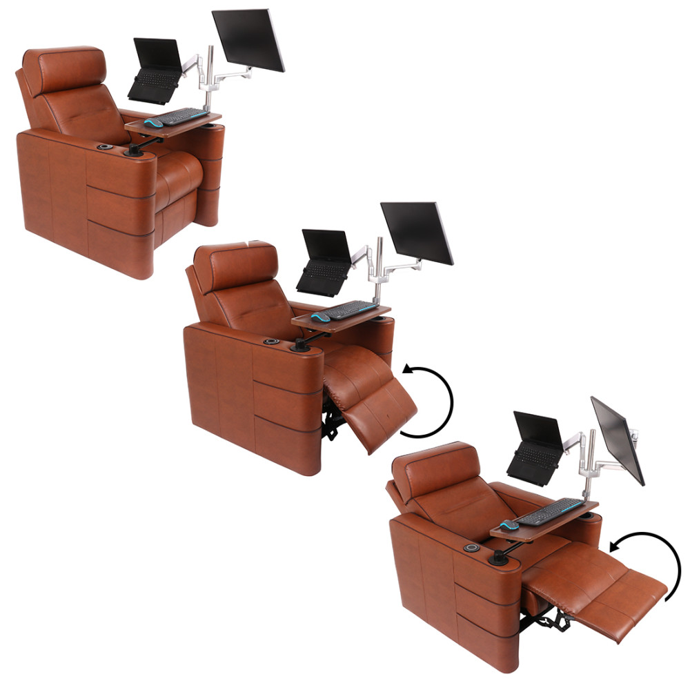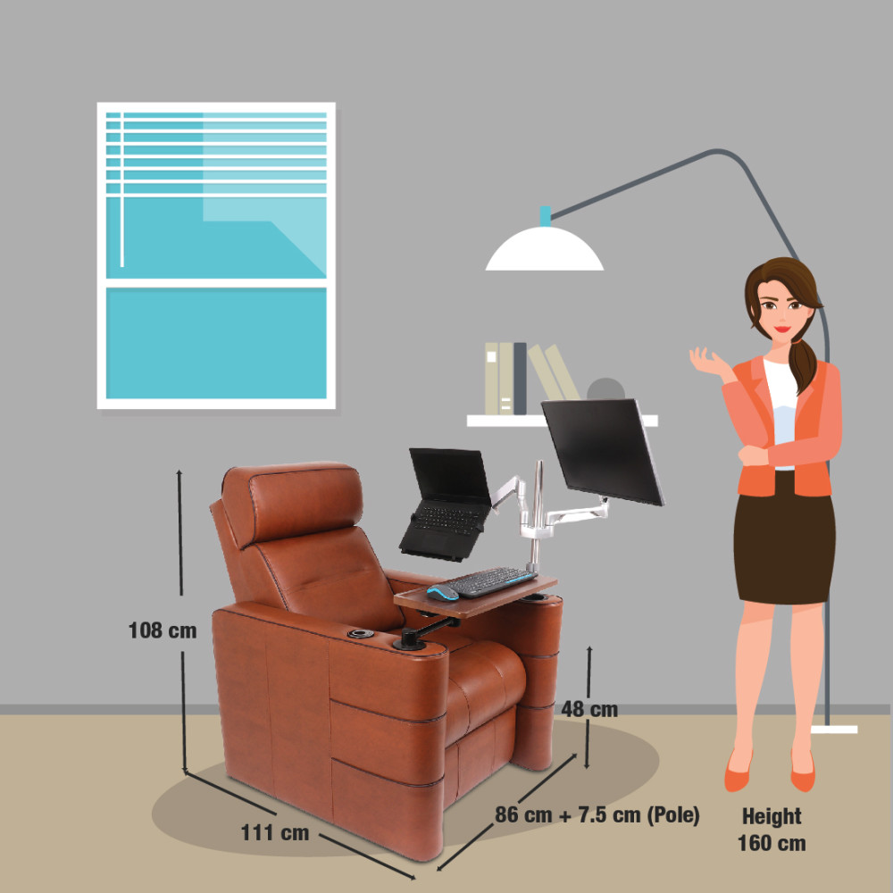 Better Posture | Better Health | Better Productivity Covered with premium leather upholstery, this design features round-arm fronts, contrasting piping & chaise design. It comes with a detachable pole with two monitor mounts with an epic GAS spring monitor arm and a laptop tray to move the user into a new era of viewing comfort to work comfortably from home and focus longer on complex tasks. Now you can easily adjust your keyboard, mouse, laptop, or monitor to your body to work smoothly and allow you to be the best of yourself in your respective profession. This recliner comes with accessories like a Tiltable table, Wireless charger, and cupholder.
